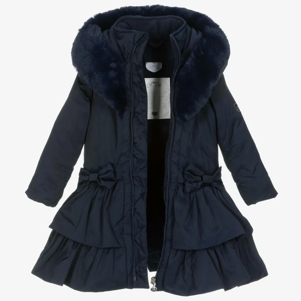 Lovely navy blue hooded coat for girls by A Dee, made in a smooth, silky fabric and lined with soft fleece for extra cosiness. Warmly padded, it has concealed side seam pockets, gently elasticated cuffs and a large hood trimmed with soft plush faux fur, for extra protection against the elements. There are ruffle trims on the peplum-shaped hem, with stylish bows on both the front and back giving a pretty finish. It fastens with an easy-to-use zip on the front and has a gorgeous sequin logo on one sleeve, adding a sparkly designer touch.