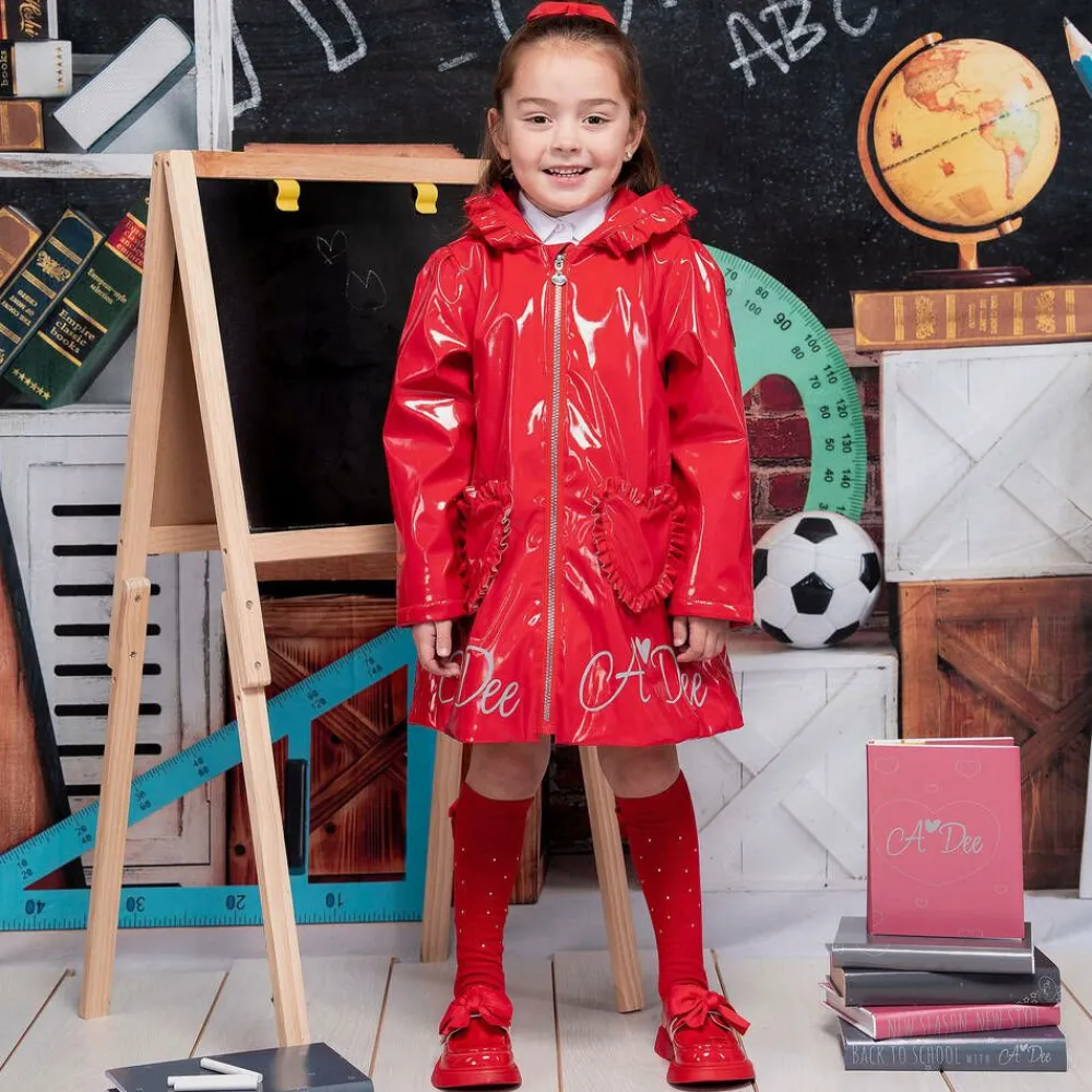 A glossy red hooded raincoat for girls by A Dee, with pretty ruffle trims. Water-resistant and cosy, it has a soft fleece lining and fleece-lined, heart-shaped pockets on the front. Reflective logo prints on the front and back, and a logo patch on one sleeve, add a stylish yet functional designer touch. The diamanté-trimmed zip has a silver-tone branded pull, and a large ruffle-trimmed heart on the back completes the look.