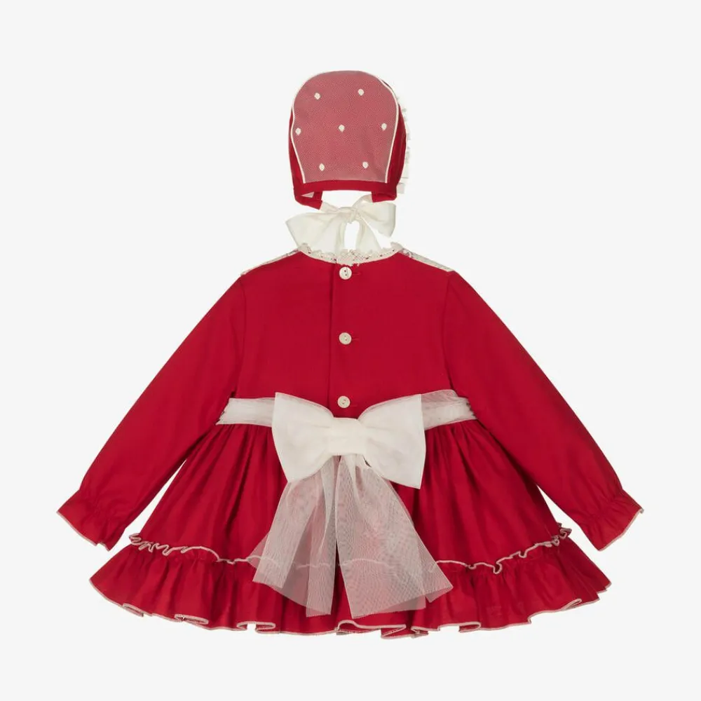 A charming red cotton dress set for baby girls by Abuela Tata, trimmed with delicate ivory lace for a classic look. Made in soft twill, the long-sleeved dress has gently elasticated cuffs, a frilled hemline and a soft cotton blend lining. Gathers on the waist create a delightfully full skirt, with pretty tulle bows detailing the front and a matching tulle sash and pearlescent button fastenings on the back. Completing the traditional look, the dress comes with matching knickers and a sweet bonnet that secures beneath the chin with satin ribbons.
