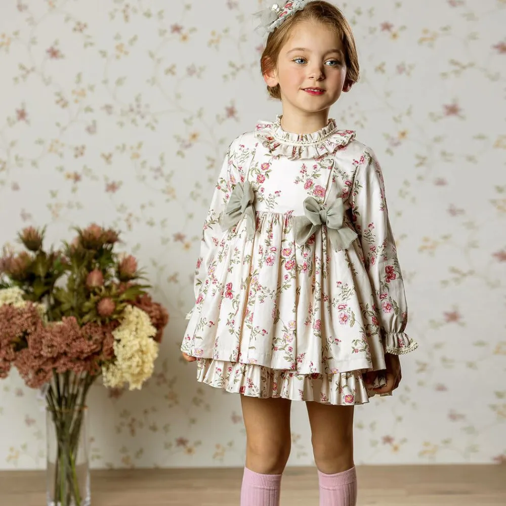 A lovely beige dress for girls by Spanish brand Abuela Tata, patterned with pretty pink flowers and green leaves. Made in a cotton-rich blend, this traditionally-styled piece has a ruffled collar, framed by a cotton lace trim. There are pretty green tulle bows on the waistline and a matching tulle sash on the back. It has long sleeves with gently elasticated cuffs and a layered hemline for added charm. The dress has a cotton-mix lining for a fuller shape and fastens neatly on the back with pearly buttons.