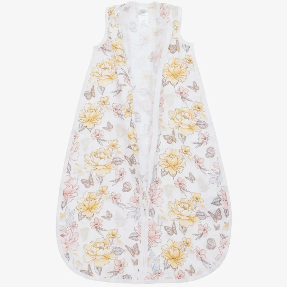 White sleeping bag for baby girls by aden + anais, made from beautifully soft organic cotton muslin. Comfortable and secure, this breathable sleeping accessory is designed in a lovely floral print in soft shades of pink, yellow and blue. It has a lightweight design with a 1.0 tog warmth rating, an fastens with an easy-to-use zip on the front.