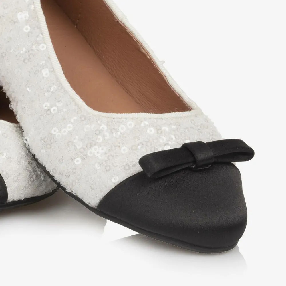 Off-white pumps for girls by British brand Age of Innocence, great for parties and special occasions. A handcrafted design, these two-tone shoes are covered with clear disc sequins that sparkle beautifully in the light. They have a black satin toe with a decorative bow on the front for an elegant look. The shoes are lined with soft leather and finished with textured rubber soles for grip.