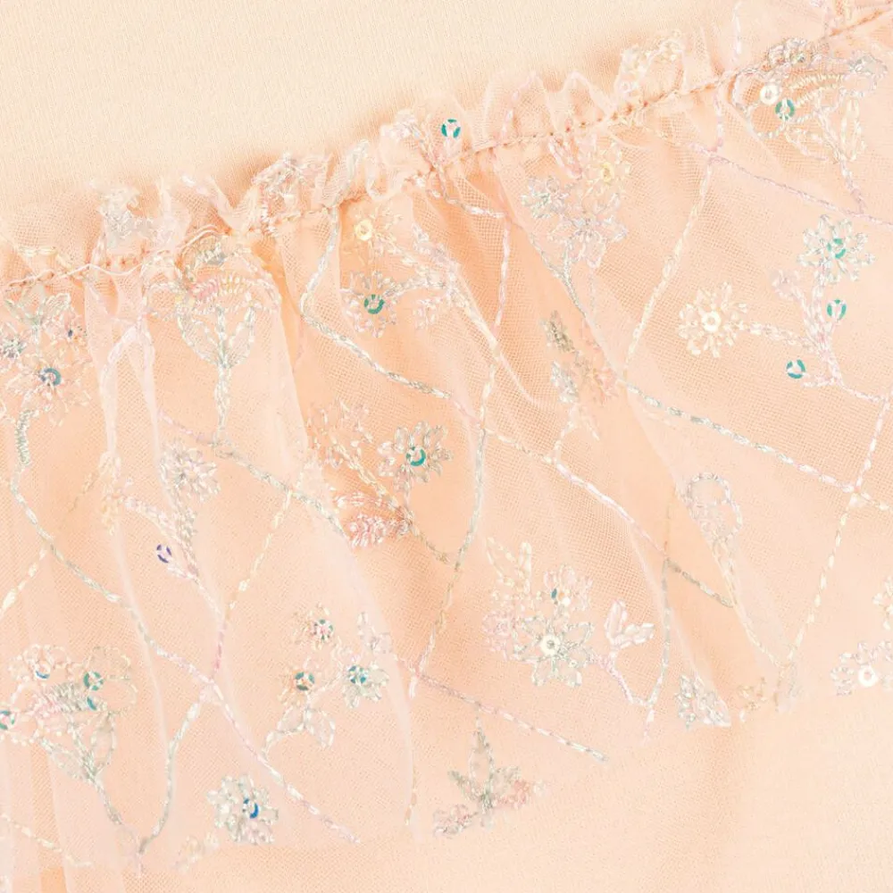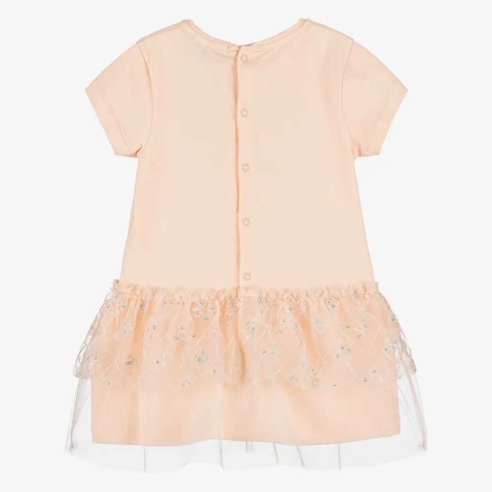 A pretty pale pink dress for baby girls by AIGNER, made in comfortable cotton jersey. The bodice is printed with a sparkly logo-branded 'Farah' bag and two cute teddy bears. The skirt is trimmed with soft tulle, the top ruffle decorated with pastel-coloured floral embroidery and shiny sequins. There are easy-fastening poppers on the back.