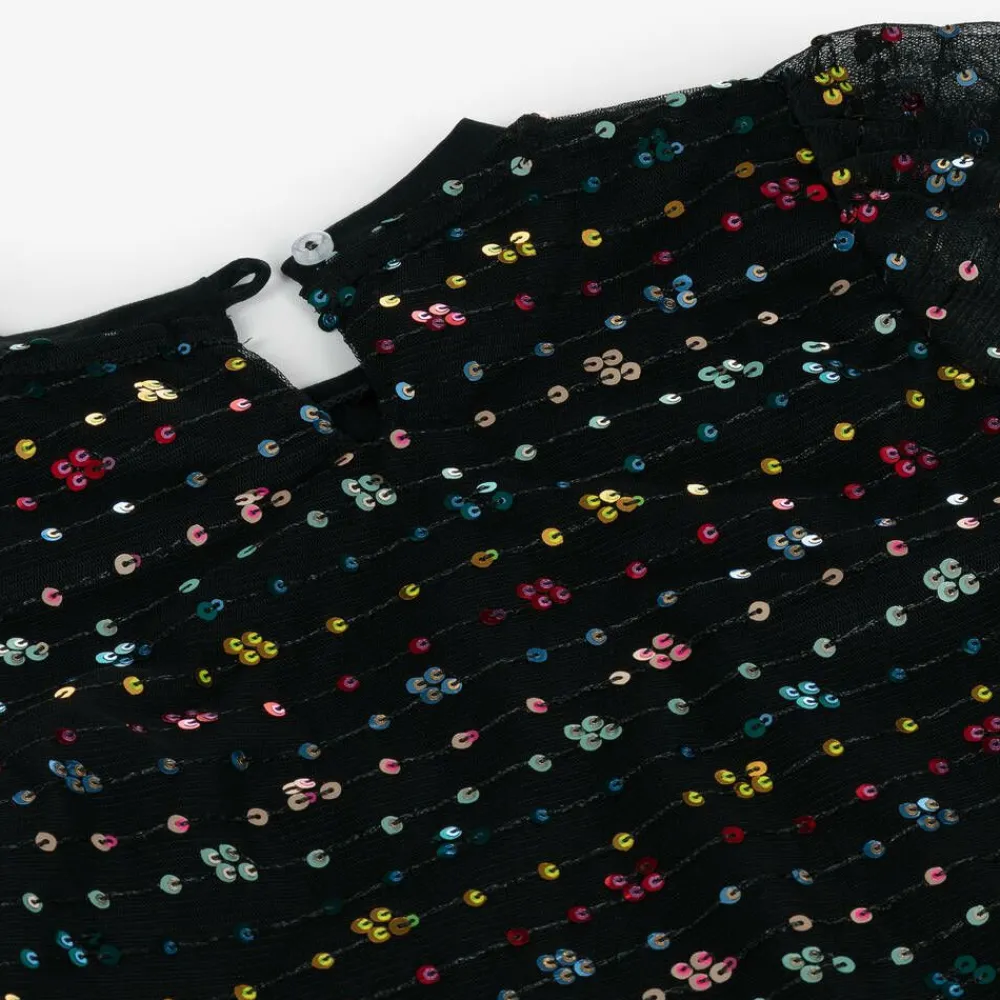 Black tulle dress for girls by AIGNER, embellished with colourful sequins that sparkle beautifully in the light. Designed in a simple A-line shape, it has semi-sheer sleeves, with raw edges and a single button fastening on the back. The soft cotton jersey lining features the brand's signature 'A' horseshoe logo in metallic gold print for instant designer appeal.
