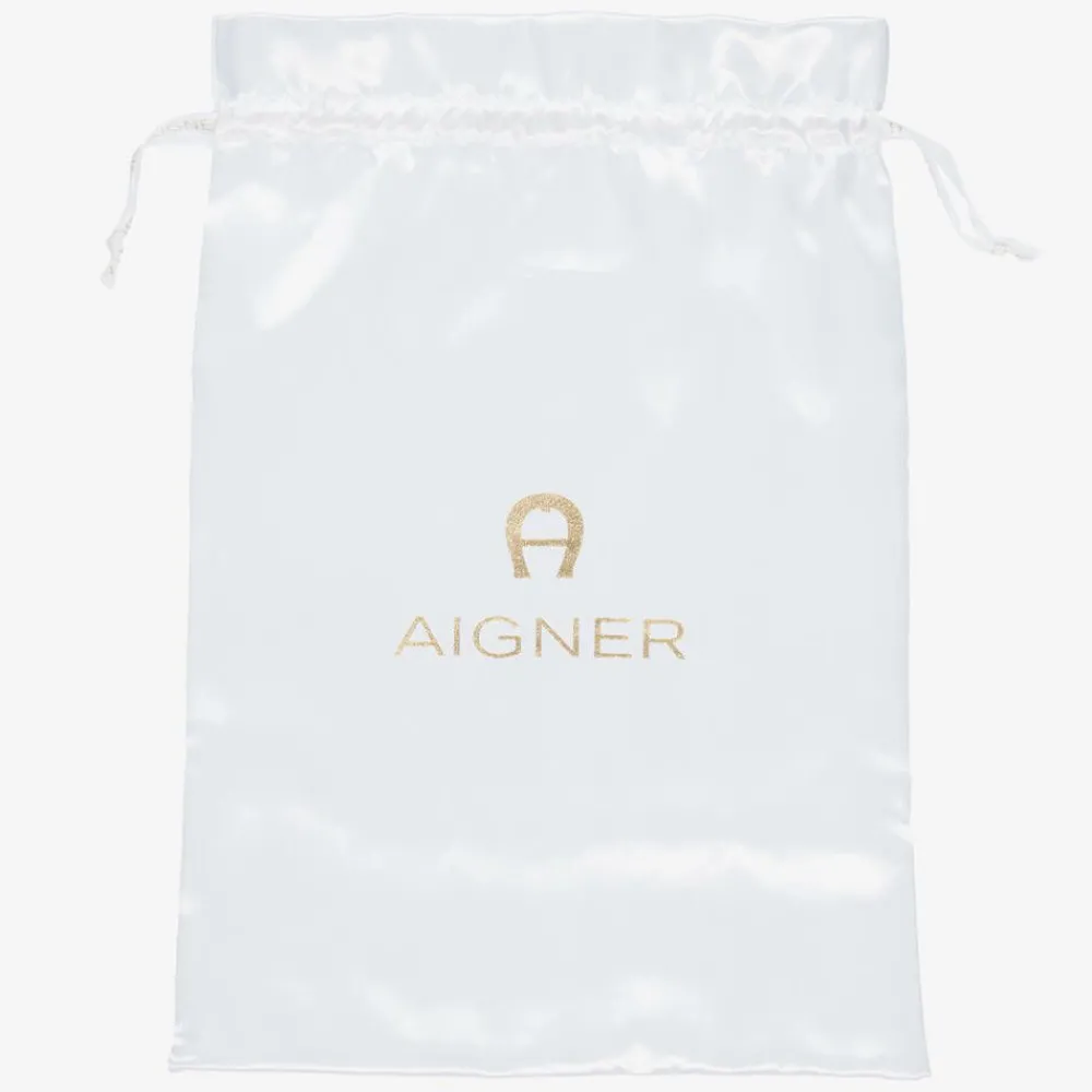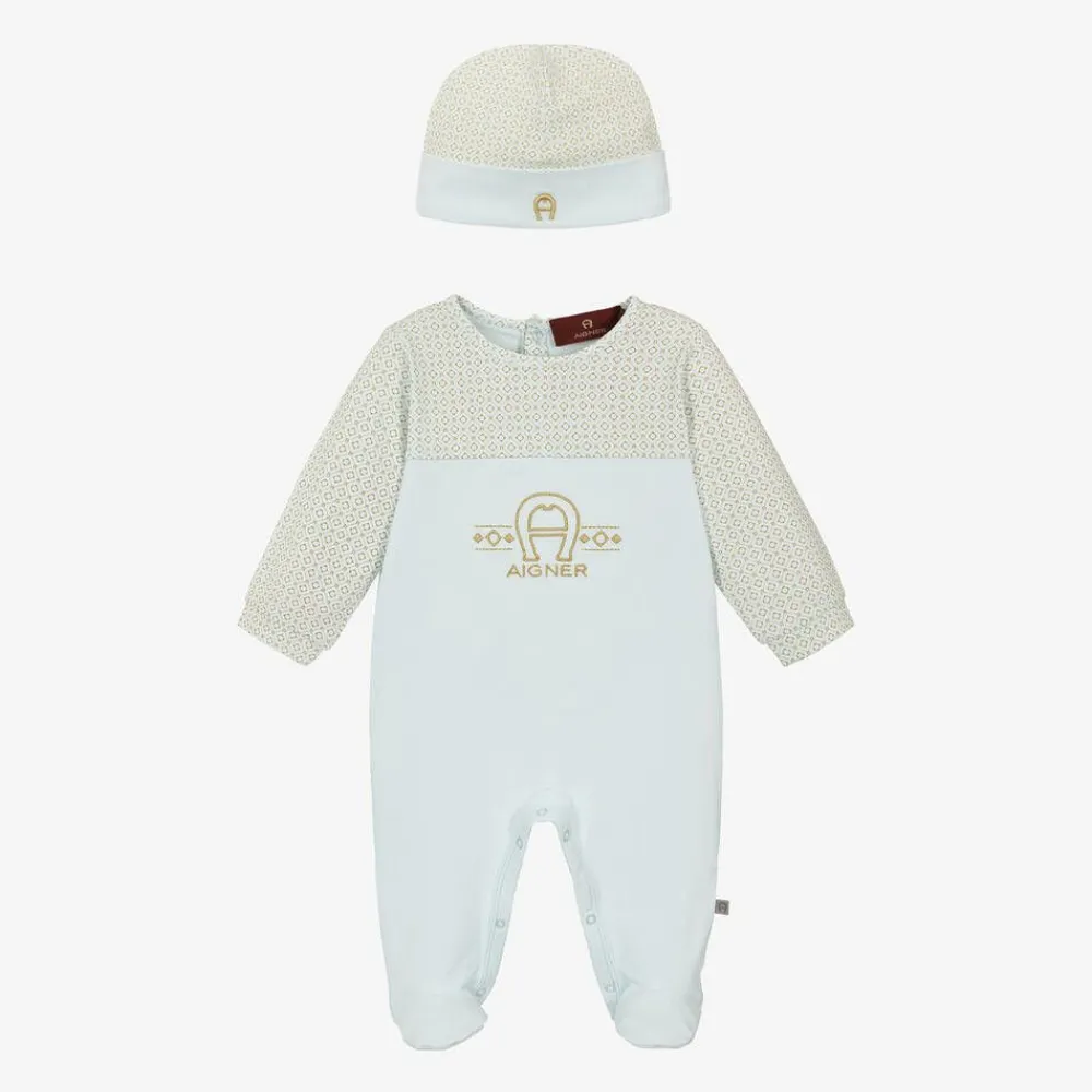 In a pale icy blue shade, this babysuit set for boys is by AIGNER. Made from soft Pima cotton jersey, both pieces are partially printed with a gold branded pattern and are embroidered with metallic gold signature 'A' horseshoe logo designs for a distinct finish. The babygrow fastens with poppers on the back and between the legs and has a logo tab stitched on the side seam. This adorable outfit is completed with a matching layette hat.
