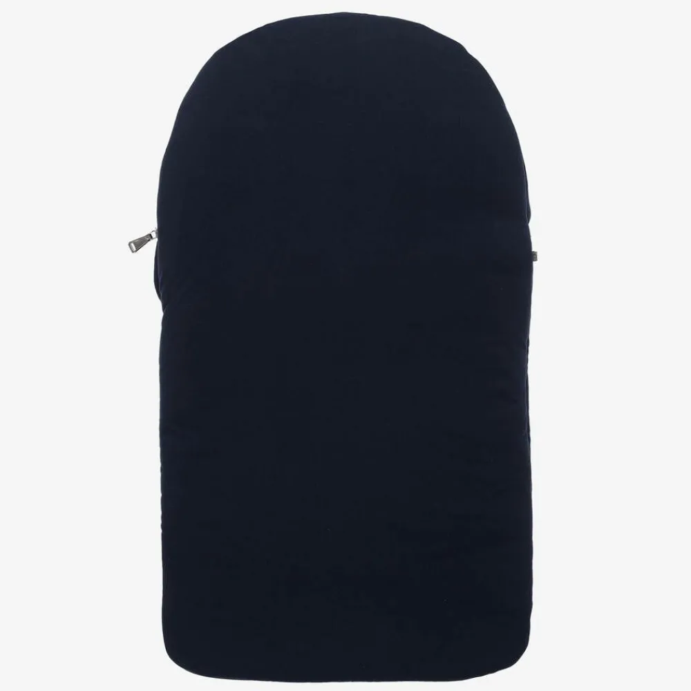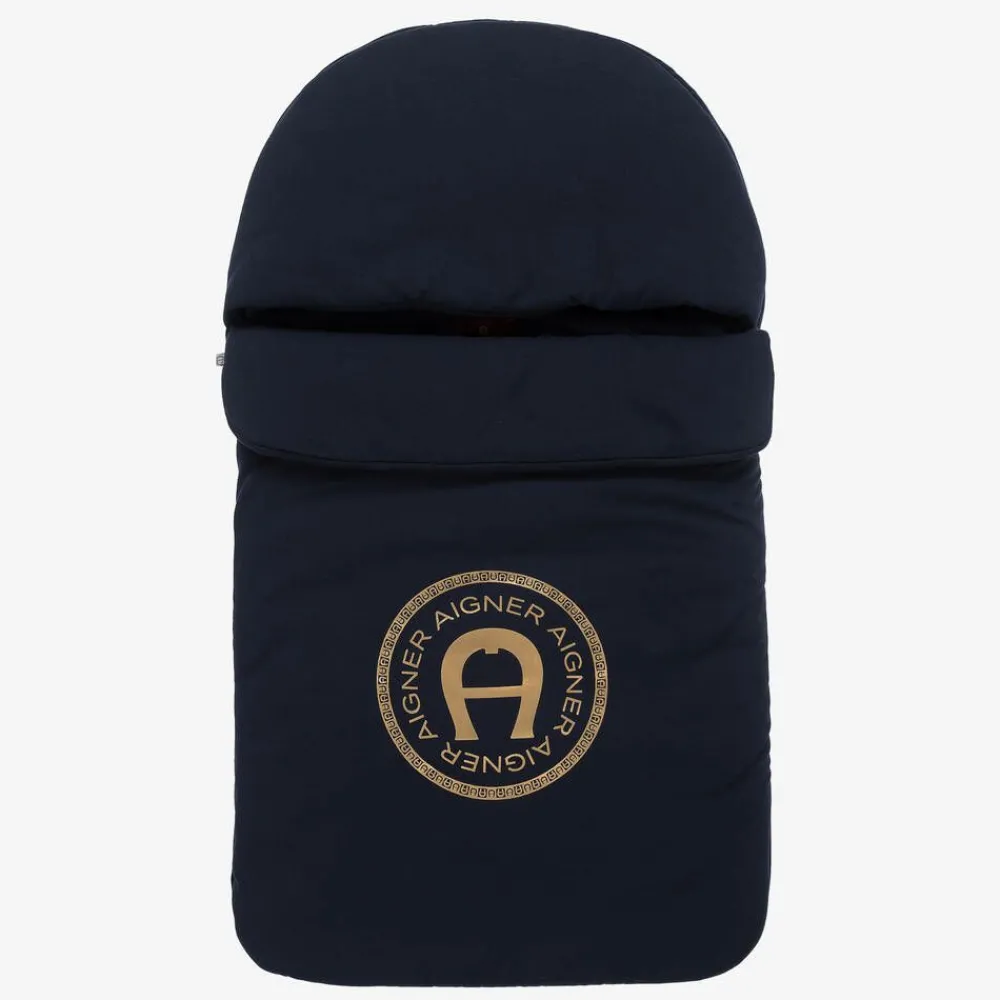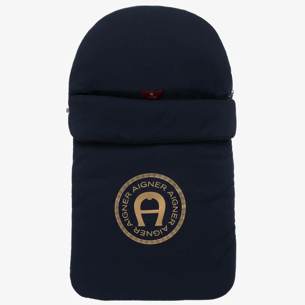 A navy blue nest for baby boys and girls by AIGNER, made in super soft Pima cotton jersey with a rounded hood and warm padding. The signature 'A' horseshoe logo is printed in metallic gold foil on the front for a branded look. It has a silver zip fastening down one side and along the base, making it much easier to get baby in and out.