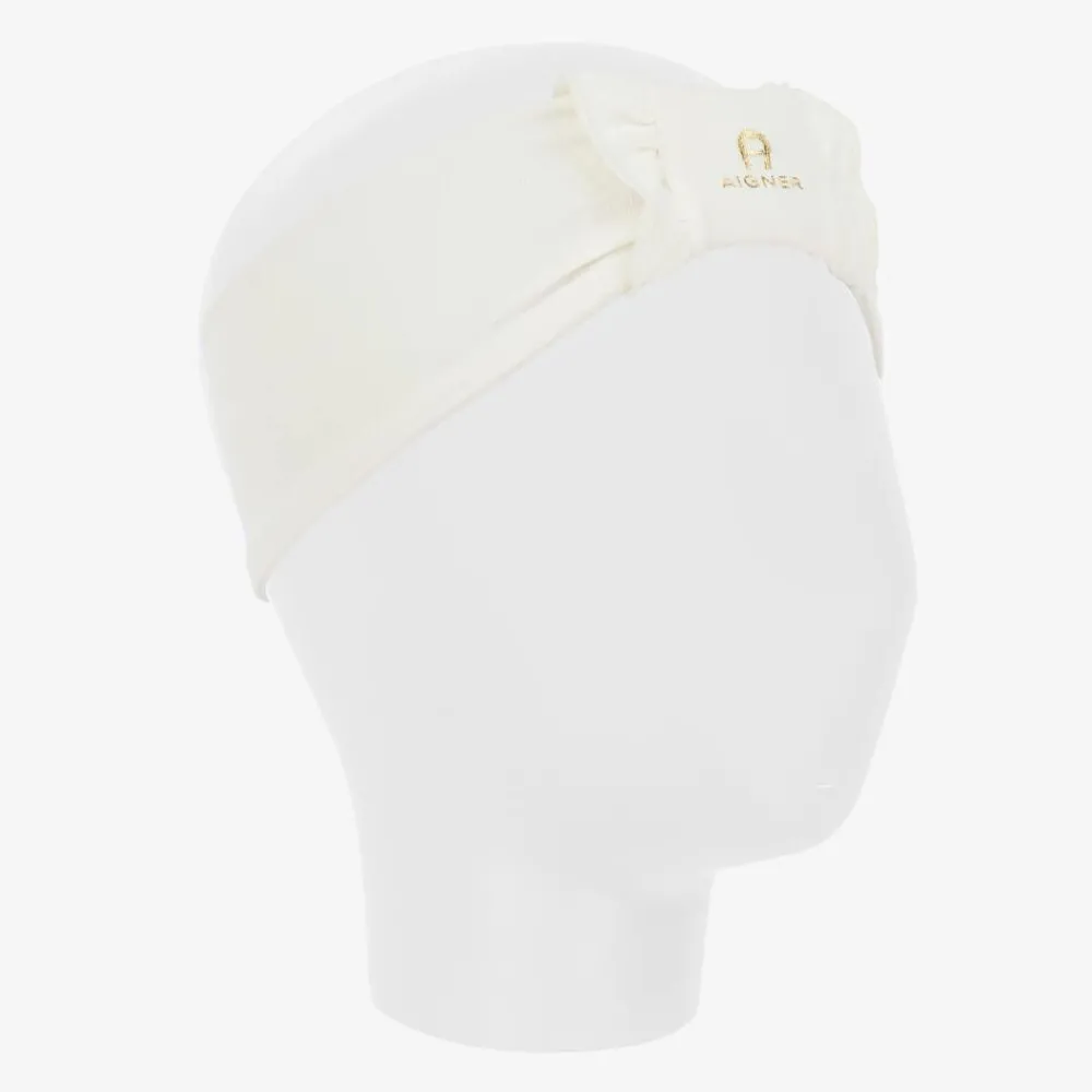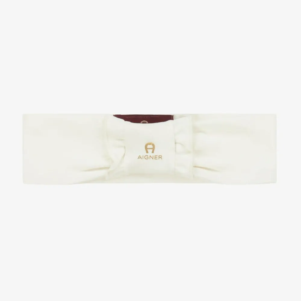 A lovely ivory headband for baby girls by AIGNER, made in soft and stretchy Pima cotton jersey for comfortable wear. It has a pretty bow detail on the front, featuring the brand's signature 'A' horseshoe logo motif in shiny, metallic gold print.