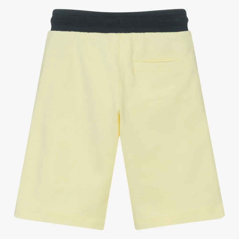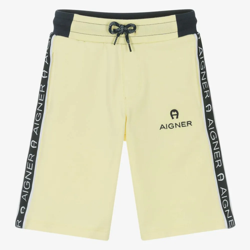 Yellow cotton shorts for boys by AIGNER, with branded taped trims. Made in soft jersey, these casual shorts have white logo embroidery on the front, featuring the signature 'A' horseshoe. They have useful pockets concealed in the side seams and a drawstring waistband for a comfortable fit.