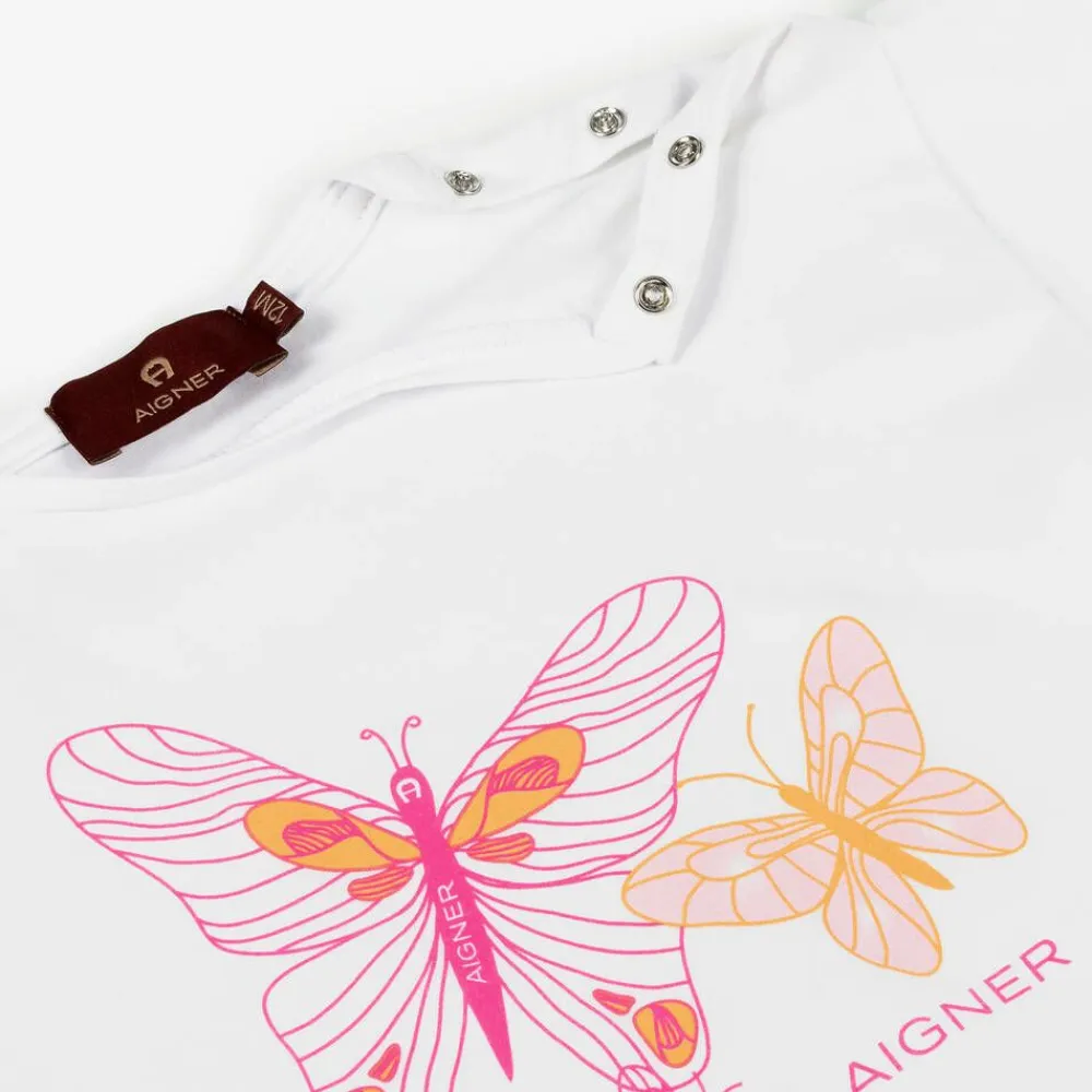 Comfortable white cotton T-shirt for baby girls by AIGNER, made in soft, stretchy jersey. It has a pretty butterfly and logo print on the front in shades of pink and pale orange.