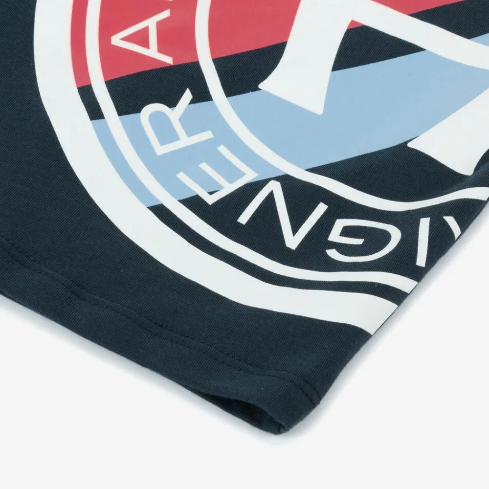 Boys navy blue T-shirt by AIGNER, made in soft cotton jersey for comfortable wear. For a distinctive designer look, there is a circular 'A' horseshoe logo design on the front in white, with red and blue stripes.