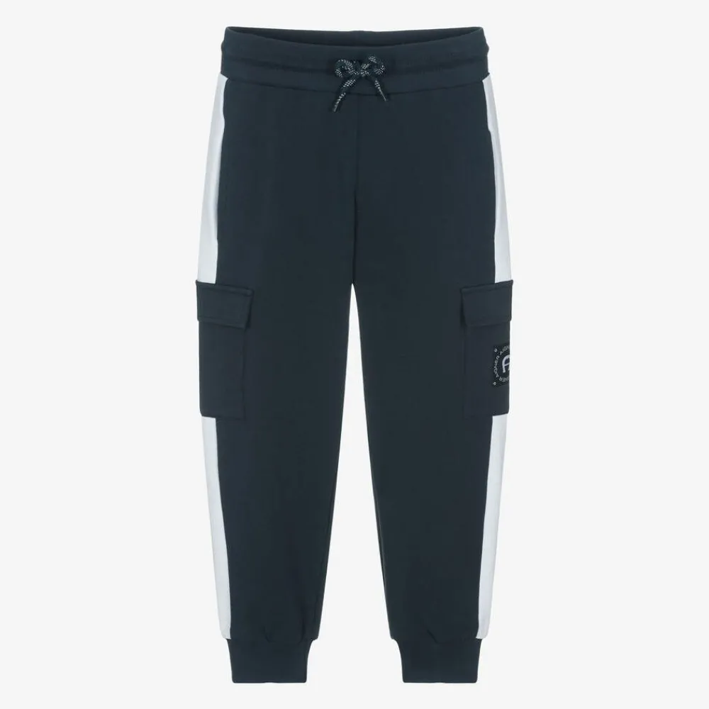 Navy blue cotton joggers for boys by AIGNER, with sporty white trims. Great for casual wear, they are made in comfortable jersey, with side seam pockets and a drawstring waistband. There are cargo-style pockets on both legs, with the brand's signature 'A' horseshoe logo patch adding a designer finish.