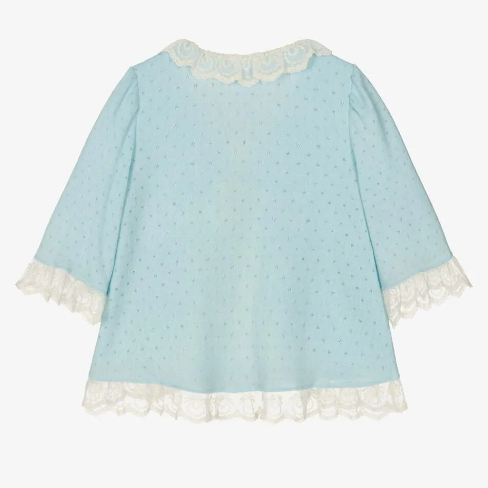 In a lovely shade of blue, this softly knitted dressing gown for girls is by AMIKI Children. Patterned throughout with a silver lurex thread for added sparkle, it is trimmed with delicate ivory lace giving the gown a vintage feel. Loose-fitting, this floaty design has pretty puffed sleeves and fastens with satin ribbon ties.