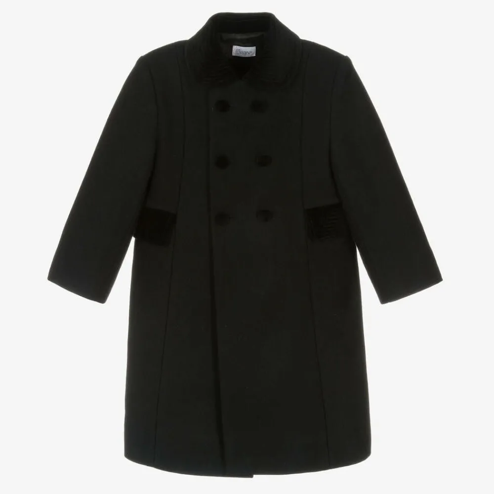 Classic black coat for boys and girls by Ancar, made in luxurious wool. A traditional, heritage style, this double-breasted coat has smart velvet trim on the collar and pocket flaps, with matching covered buttons. On the back, it has an inverted pleat and a half-belt detail with decorative buttons. The look is complete with a silky satin lining.
