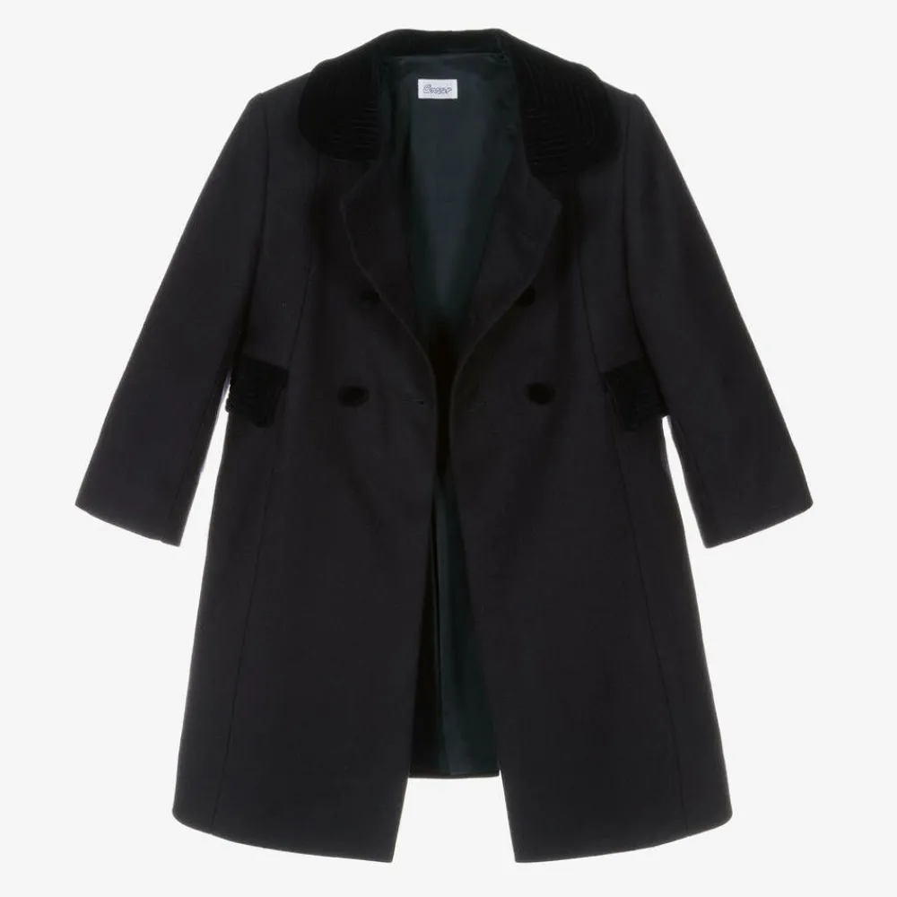 Classic navy blue coat for boys and girls by Ancar, made in luxurious wool. A traditional, heritage style, this double-breasted coat has smart velvet trim on the collar and pocket flaps, with matching covered buttons. On the back, it has an inverted pleat and a half-belt detail with decorative buttons. The look is complete with a silky satin lining.