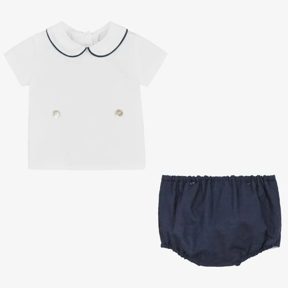 A smart, navy blue and white cotton shorts set for baby boys by Ancar. The lightweight shirt has a Peter Pan collar with navy blue trims and attaches to the shorts with buttons. The navy blue, linen blend shorts are fully lined and have a comfortable partially elasticated waistband.
