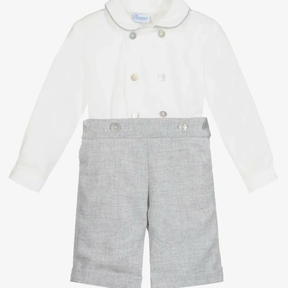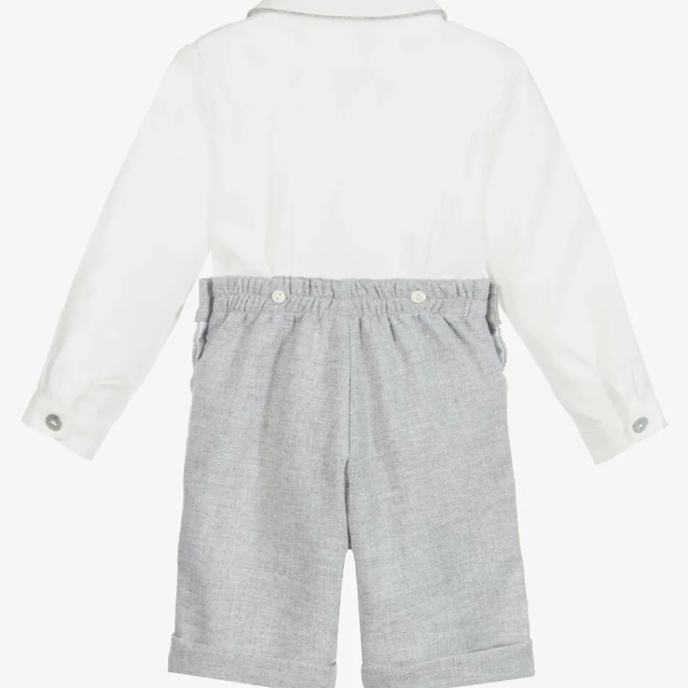Boys traditional white and grey shorts set by Ancar. The lightweight cotton blend shirt fastens at the front with mother-of-pearl buttons, with matching buttons to attach to the shorts at the front. The grey piping on the collar matches the fully lined, wool blend shorts, which have smart turn-ups.