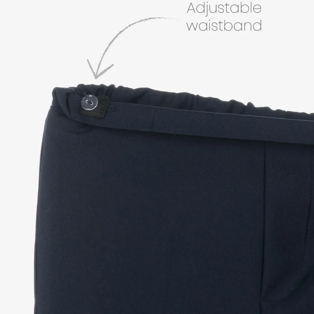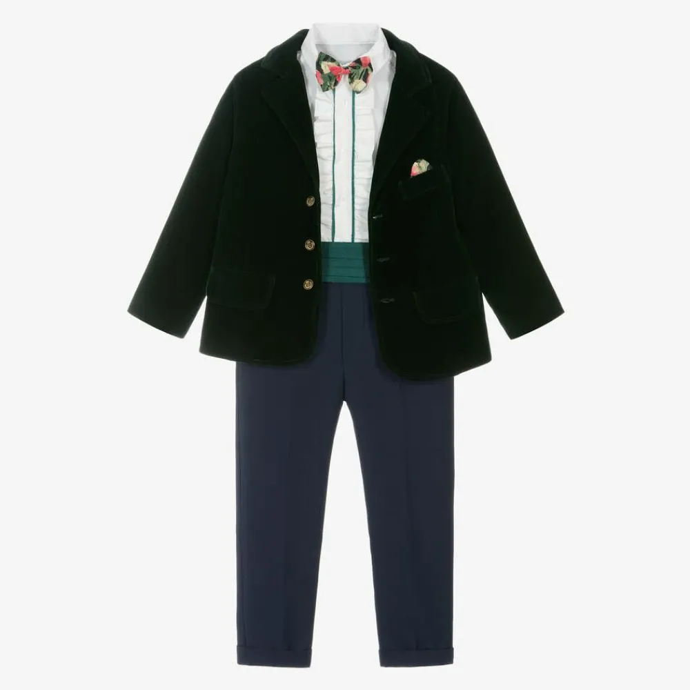 Lovely for special occasions, this green and navy blue suit for little boys is by Andreeatex. Made from soft velvet with a lightweight lining, the blazer has a revere collar, faux flap pockets, and a fixed floral pocket-square detail on the chest. It fastens with black and gold logo-crest buttons on the front. The white long-sleeved cotton shirt has green piping and frilled trims on the front button placket and a detachable popper-fastened floral bow tie under the smart pointed collar. To complete the outfit, the smooth twill and lightly lined trousers have a silky green pleated button-on cummerbund and turned-up cuffs. Easy to pull on, older sizes have an adjustable elasticated waist for a comfortable fit.