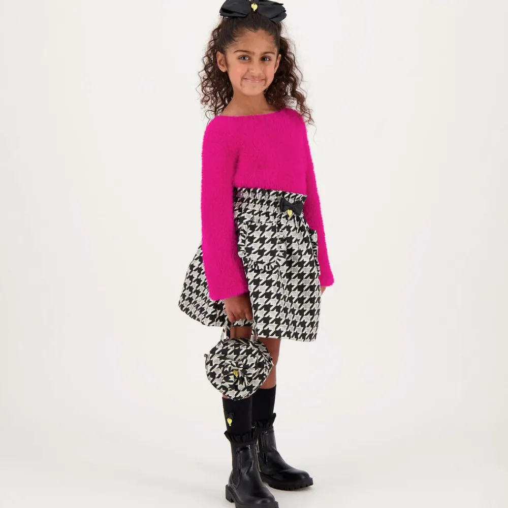 A lovely black handbag for girls by Angel's Face, with a silver houndstooth jacquard pattern. Designed in a cute heart shape, the single zip-fastening compartment is decorated on the front with a pretty bow, detailed with the brand's signature gold-tone heart charm. There are carry handles on the top or for an alternative look, the bag can be carried on the shoulder by the detachable, gold chain shoulder strap.
