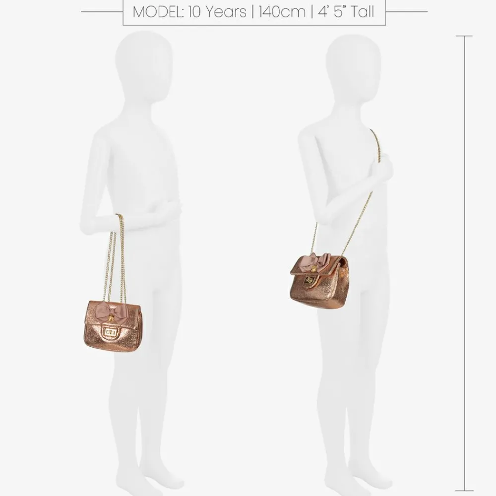 Girls rose gold faux leather shoulder bag from Angel's Face, with a gold chain-link strap. It has a pink grosgrain ribbon bow and a signature gold angel wings charm on the front. The main compartment is lined in fabric and there is a zipped inner pouch. There is a gold metal clasp to fasten.