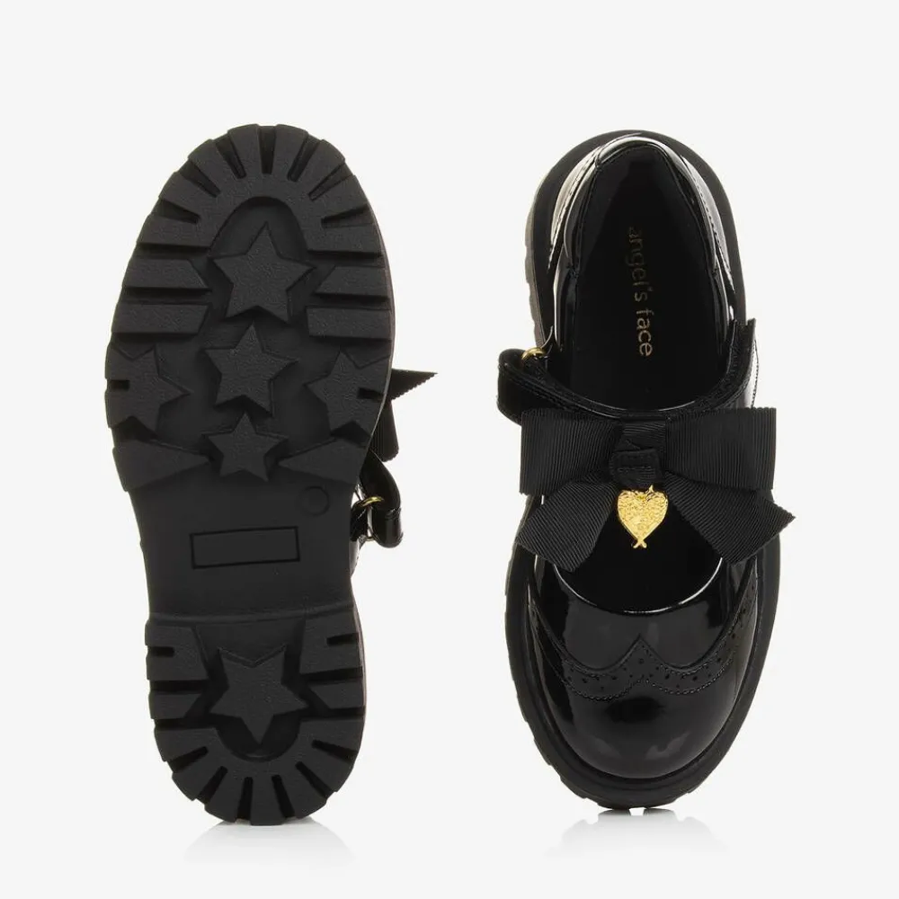 Girls black Mary Jane shoes by Angel's Face, made in glossy faux patent leather. They fasten easily with a velcro strap, trimmed with the designer's signature grosgrain bow and golden heart charm. Ideal for school, they are lined in soft textile and lightly padded for comfort, with chunky non-slip rubberised soles for safety.