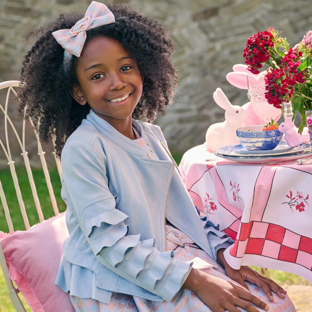 Pale blue biker jacket for girls by British brand Angel's Face, made in super soft faux suede. It has gold and crystal logo popper fastenings on the neck for an edgy, yet glamorous look. It has shiny gold zip fastenings on the front and pockets that have the designer's signature gold heart charm pull tabs. Lined in luxuriously soft satin, there are ruffle trims on the sleeves and hem for a feminine touch.