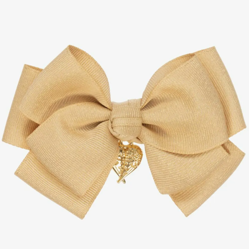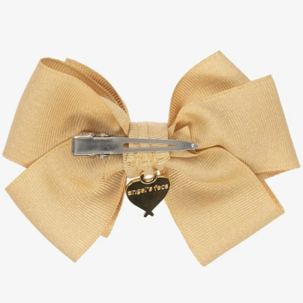 Girls metallic gold bow hair clip by Angel's Face, with a gold Angel Wings metal charm logo. Made in soft grosgrain ribbon and set on a slide-in metal clip.