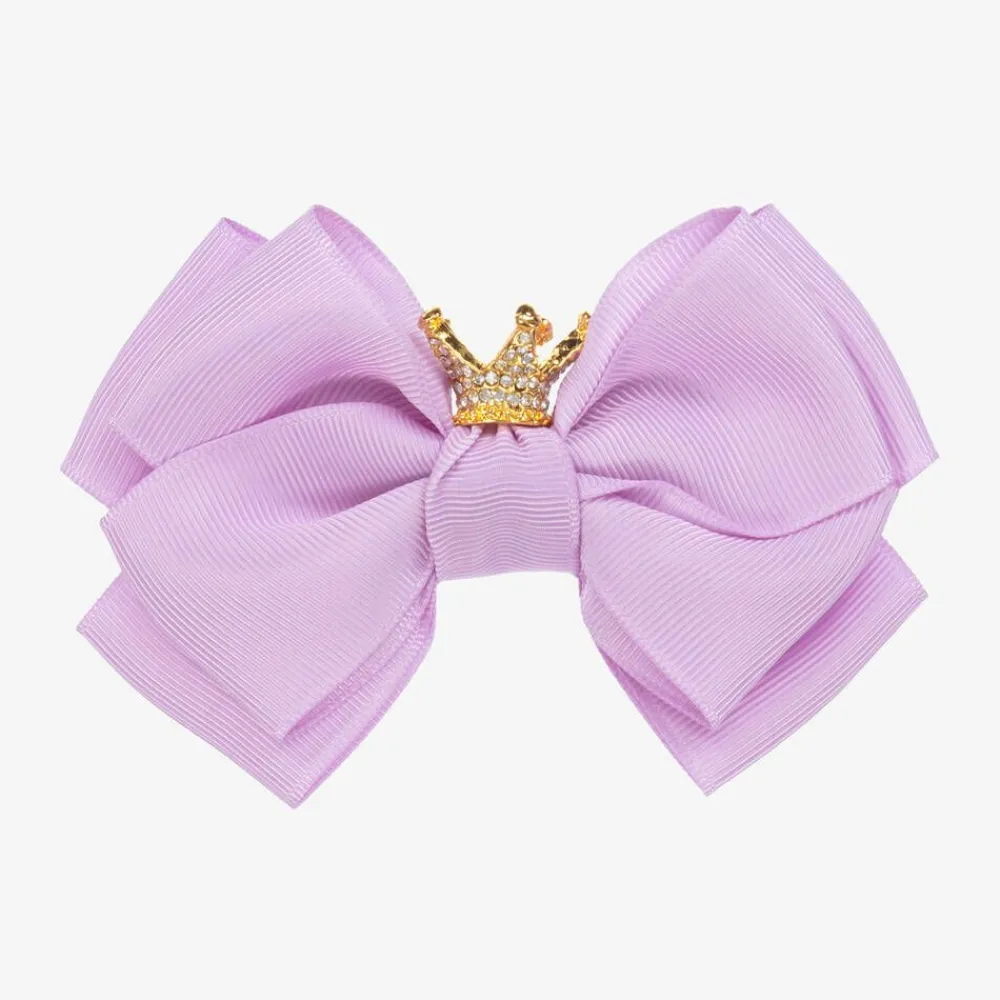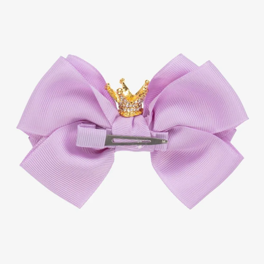 Beautiful lilac purple bow hair clip for girls by Angel's Face, made with luxurious grosgrain ribbon. A lovely finishing touch to her special outfit, it is topped with a sparkly diamanté crown and sits on a simple clip.