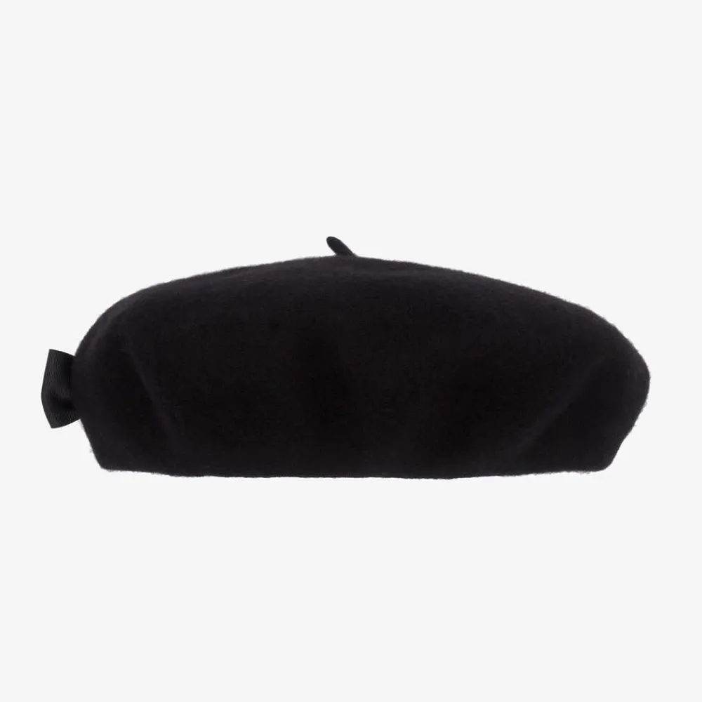 A classic black felted wool beret for girls by British brand Angel's Face. It has the designer's signature golden heart charm and bow on the front, with a ribbed black inner brim for a good fit.
