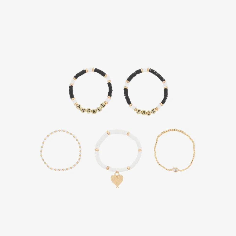 A pack of five bracelets for girls by Angel's Face in stylish shades of black, white, and gold. Ideal for layering together or wearing individually, they feature fun letter beads that spell out the brand name, a diamanté heart, and an iconic angel-wings logo charm. Made from stretchy elastic, they are comfortable to wear and add a pretty finish to any outfit.
