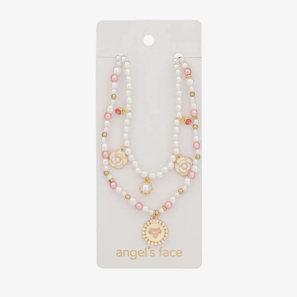 Pretty pink and white pearl necklace for girls by British brand Angel's Face. Designed in a double strand, the shorter length has five pretty charms consisting of one large pearl in a gold metal setting, two white and gold floral charms, with a pearl in the centre and two pink gems set in gold metal for an added touch of sparkle. The outer, longer strand features a circular pendant with the brand's signature heart and bow logo in the centre surrounded by tiny pearls. It fasten with a gold metal clip, which can be adjusted for the desired fit.