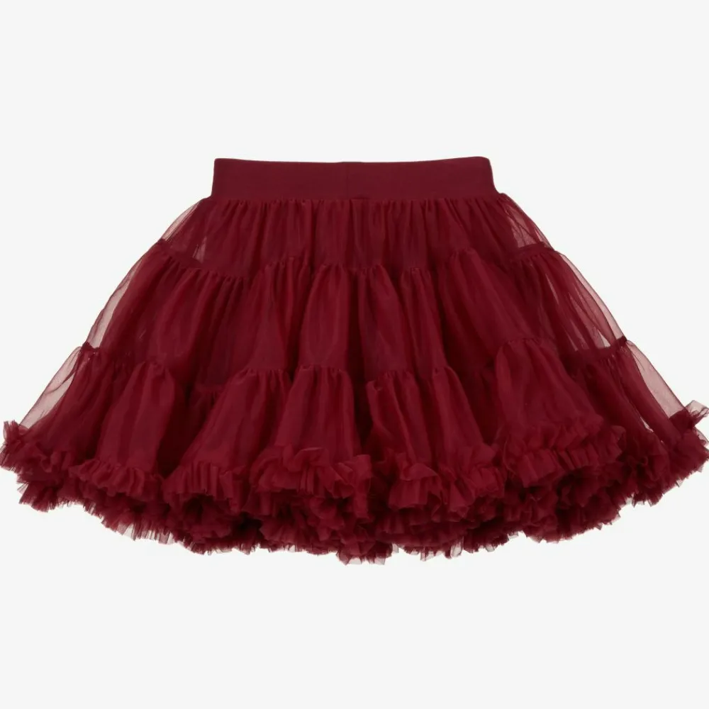 Red skirt for girls by Angel's Face, made with layers of tulle, tiered and gathered at the hem for added bounce. It is fully lined for comfort and has an elasticated waist with the golden wing logo charm and a bow.