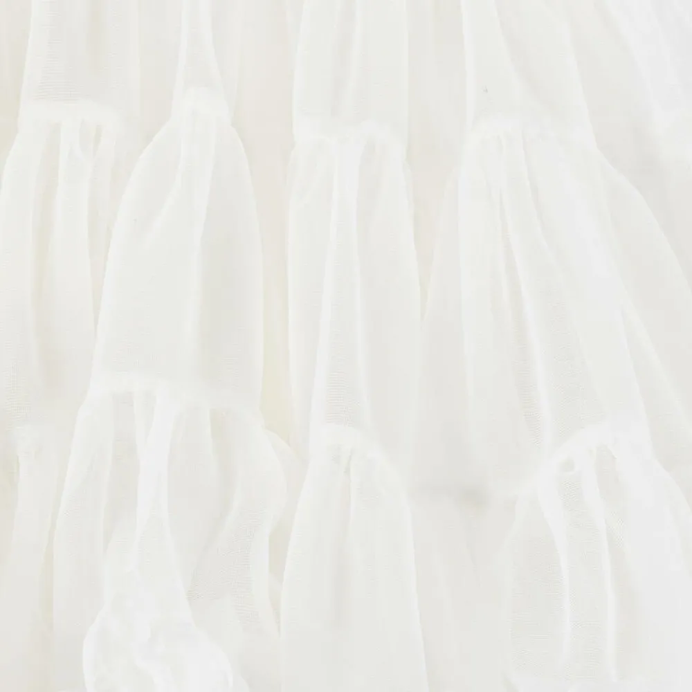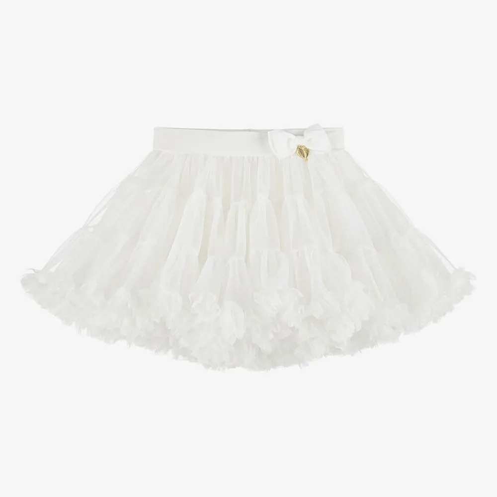 Off-white skirt for girls by Angel's Face, made with layers of tulle, tiered and gathered at the hem for added bounce. It is fully lined for comfort and has an elasticated waist with the golden wing logo charm and a bow.