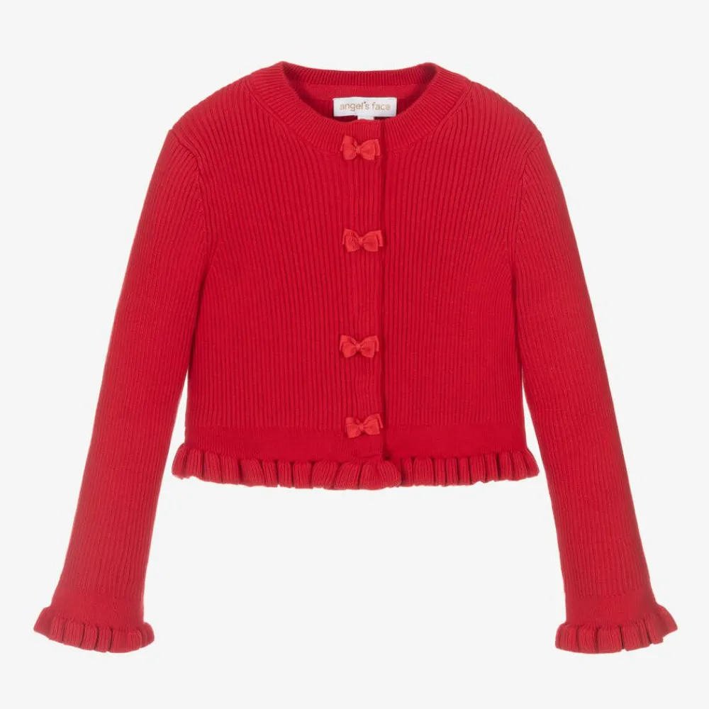 A lovely red cardigan for girls by Angel's Face. It is made in a softly ribbed cotton knit and has pretty ruffle trims. The concealed popper-fastening placket is decorated with sweet grosgrain bows down the front.