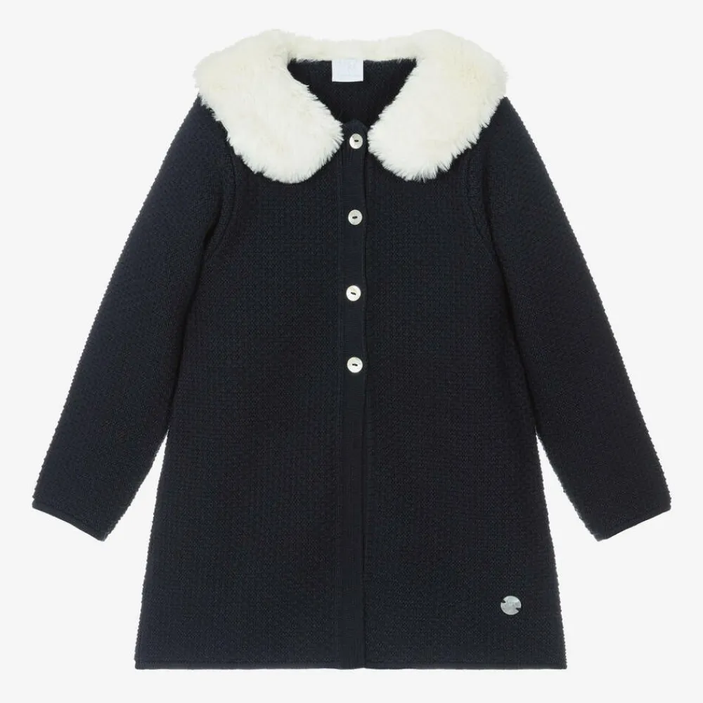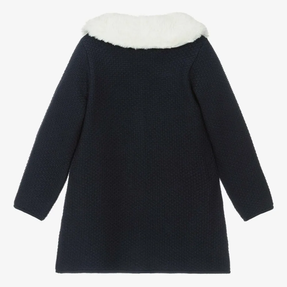 Traditionally styled, this navy blue coat for girls by Artesanía Granlei is made from a soft knit. Fastening with mother-of-pearl buttons on the front, it has a super cosy ivory faux fur collar and is stitched with a faux mother-of-pearl logo charm near the hemline for a branded finish.