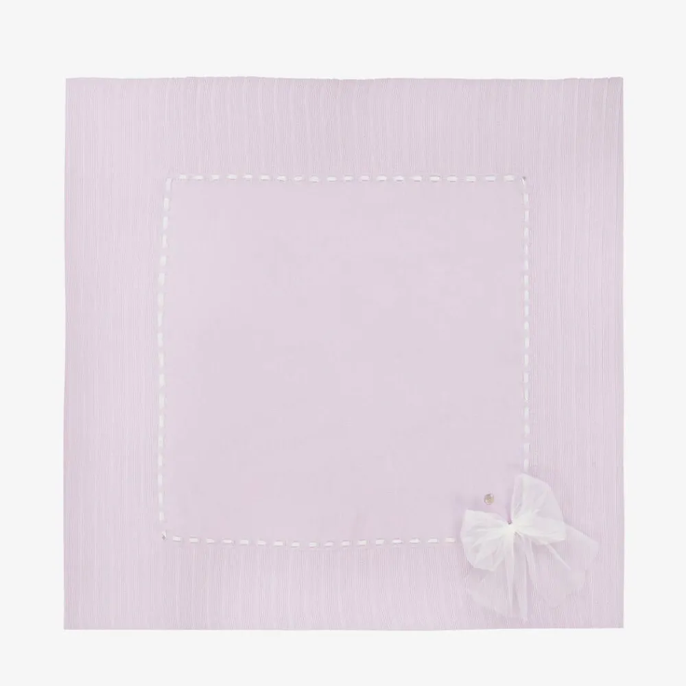 Lovely lilac purple blanket for baby girls by Spanish brand Artesania Granlei, with a large, white tulle bow in one corner and a matching tulle trim interlaced around the border. Made in a soft, lightweight knit, it has a mother-of-pearl logo charm sewn in one corner and is ideal for use in the nursery or for presenting baby to family and friends.