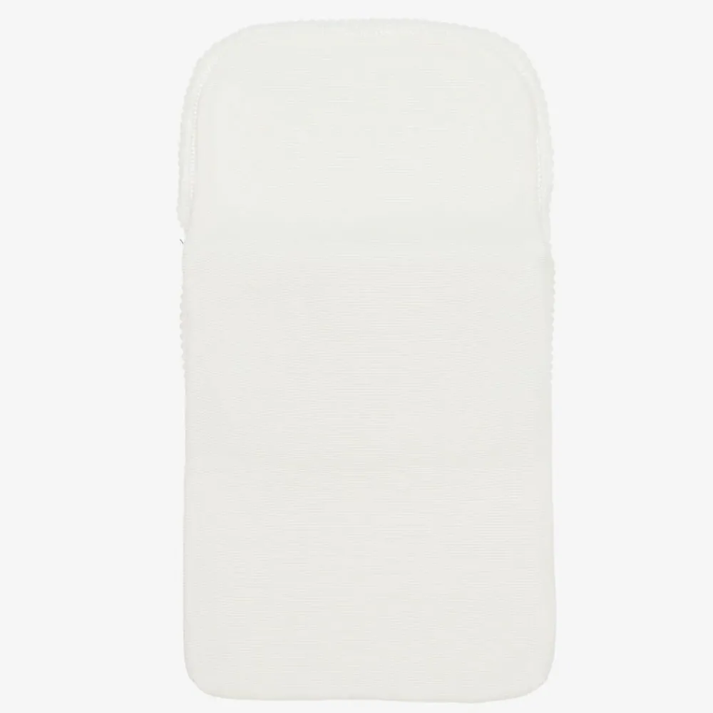 A lovely ivory knitted nest for baby boys and girls by Spanish brand, Artesanía Granlei. It is lightly padded for cosy comfort and has a long side zip to easily get your little one in and out. It has a delicate pattern on the front flap, with beautiful scalloped edges, and a faux mother-of-pearl logo charm on the front.