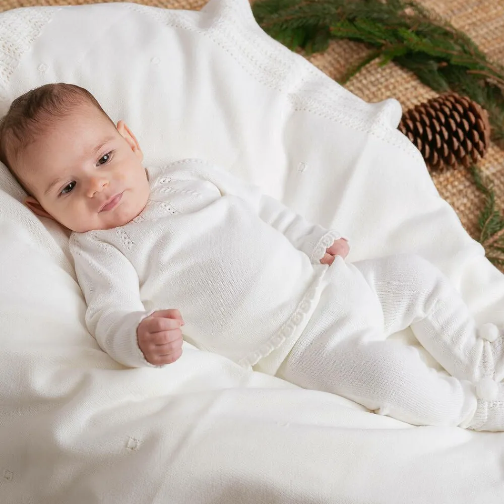Ivory knitted shawl for baby boys and girls by Spanish brand Artesanía Granlei, with a central square spot pattern and a contrasting border with pretty bands of open stitching. Soft and lightweight, it has an iridescent mother-of-pearl logo charm sewn in one corner, and is ideal for use in the nursery, or for presenting baby to family and friends.