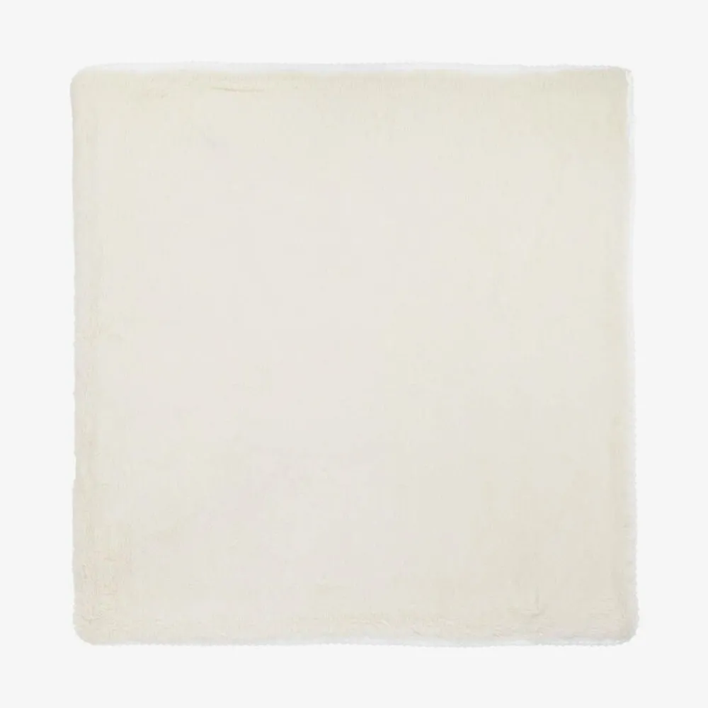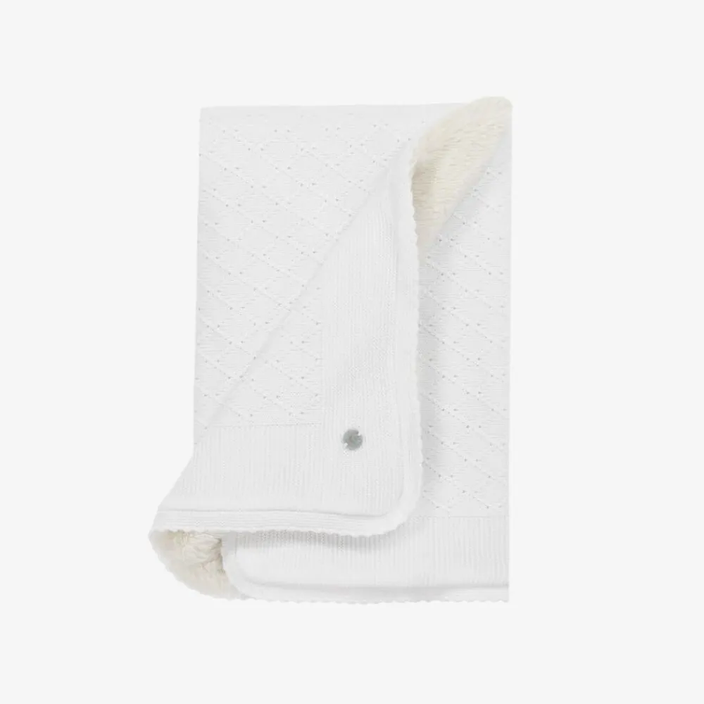 Cosy white blanket for baby boys and girls by Spanish brand Artesanía Granlei. Made in a soft, lightweight knit, it has a central diamond pattern with a pretty, scalloped border and a wonderfully warm, faux fur lining. It is ideal for use in the nursery or when out and about in the pram or car seat.