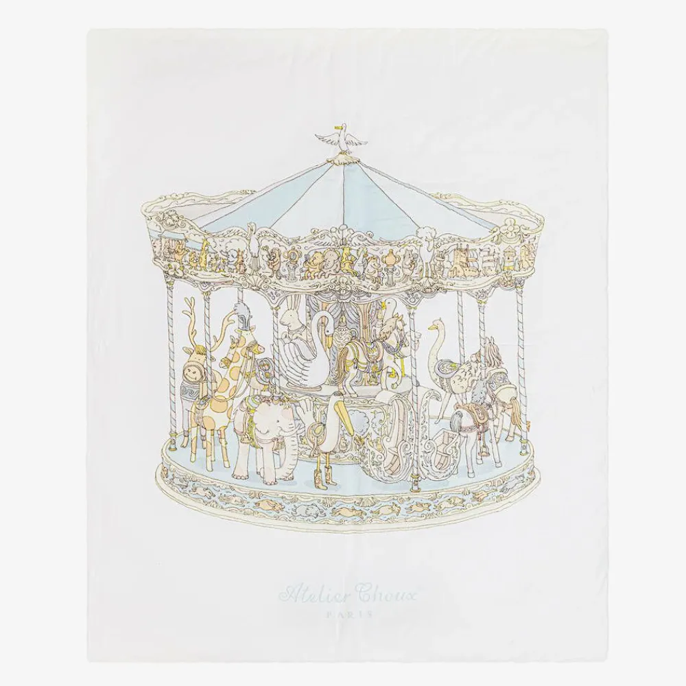 A reversible white duvet for little boys and girls from Atelier Choux Paris, made from gentle organic cotton with mid-weight, anti-allergenic padding. Lovely for a little one moving to a bigger bed, this beautiful Parisian-inspired quilt features a signature hot air balloon print on one side and a sweet carousel illustration on the other in soft hues of blue and yellow.