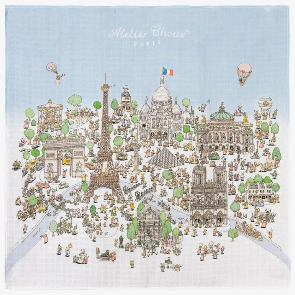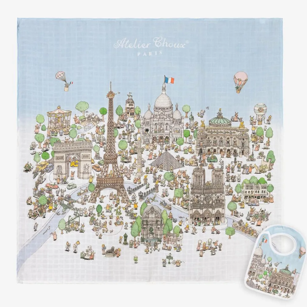 A charming, light blue swaddle and bib set for baby boys and girls by luxury French brand Atelier Choux, made in soft organic cotton. Lightweight and functional as well as beautiful, it can be used as a tummy time blanket, for baby changing, or as a decorative nursery item. The matching, double-sided bib has easy-to-use, adjustable popper fastenings for a great fit. Both pieces are beautifully illustrated with a fun, Paris-themed print and come in a complementary gift box.