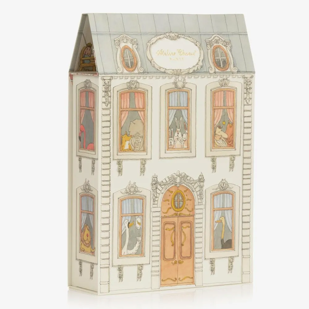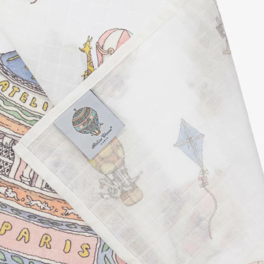 A three-pack of ivory swaddles for baby boys and girls by Atelier Choux Paris, beautifully packaged in the signature hotel gift box. These lightweight organic cotton muslins are illustrated with hot air balloons, a pink carousel and a Monceau Mansion for charming nursery accessorising. These elegant cloths can also be used as a privacy cover for breastfeeding mothers, a lightweight blanket for warmer days or to wipe baby's face clean.