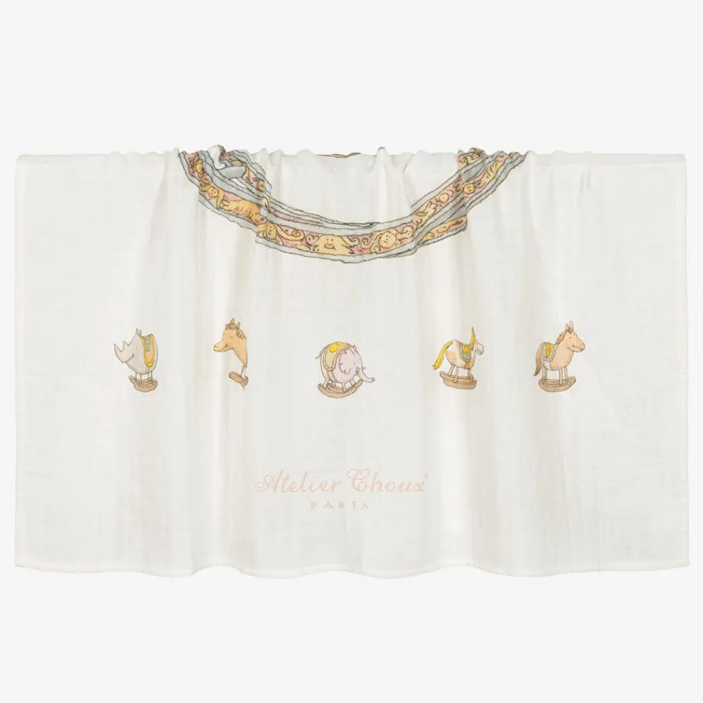 Luxurious ivory swaddle and bib set for baby boys and girls by French brand Atelier Choux, made in organic cotton. The comfortable and lightweight elegant swaddle has a beautifully illustrated rocking horse print on the front. The lovely cotton satin bib has a print on both sides and fastens with adjustable poppers. Ideal for gifting, this set is presented in a box with illustrations of animals and a Parisian townhouse.