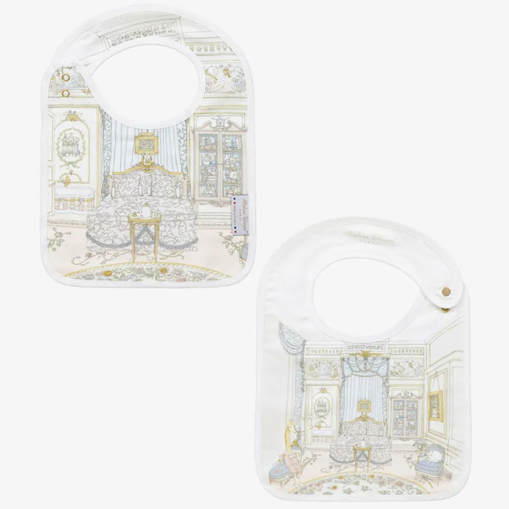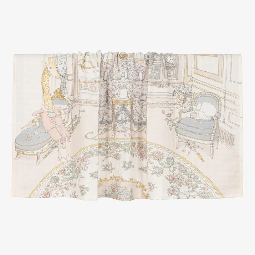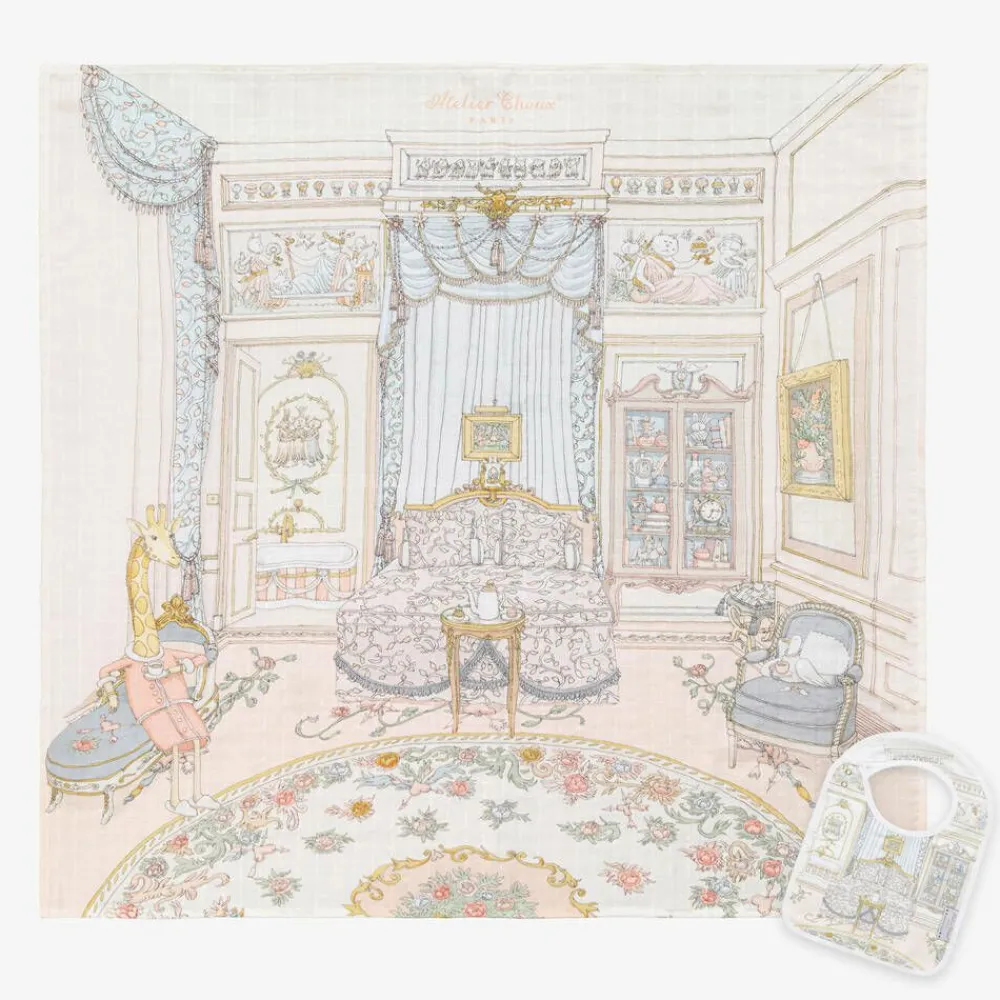 Luxuriously soft, pale pink organic cotton swaddle and bib set for baby boys and girls by Atelier Choux Paris. The set is beautifully illustrated with an intricate print of a French bedroom and whimsical animals in pale blue, yellow and ivory tones. Versatile and lightweight, the charming muslin can be used as a light blanket and breastfeeding accessory as well as for baby changing, swaddling or as a tummy time blanket. The matching, double-sided bib has adjustable and easy-fastening poppers on the side. Lovely for gifting, the set comes with a printed signature gift box.