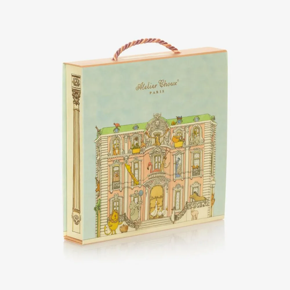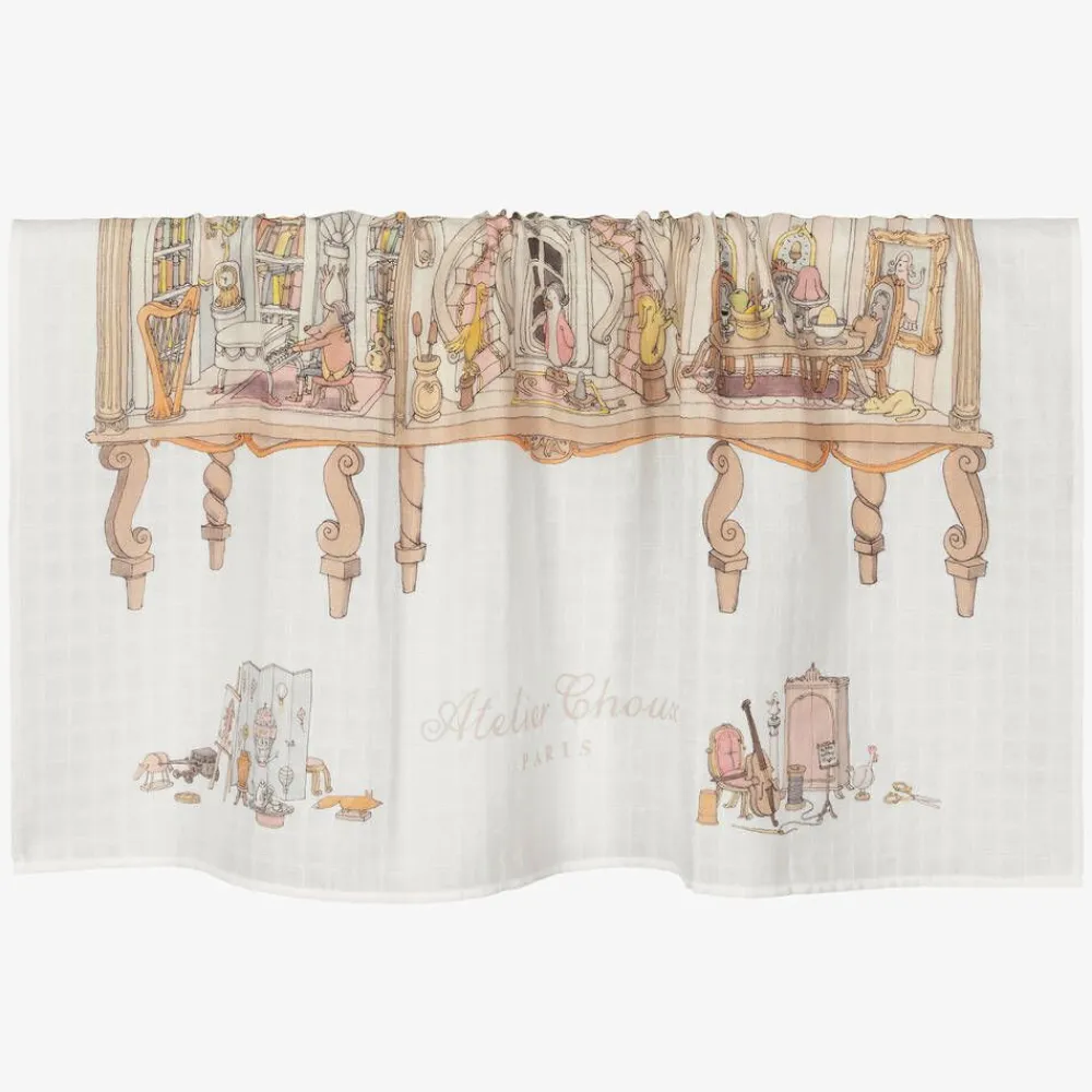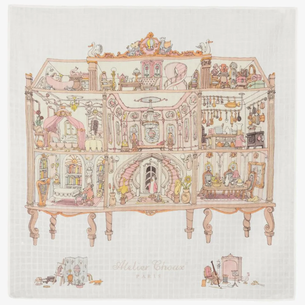 A beautiful, ivory swaddle and bib set for baby girls by luxury French brand Atelier Choux Paris, made in lightweight, organic cotton. Ideal for use as a tummy time blanket, changing surface, or for privacy while breastfeeding, the swaddle is beautifully illustrated with a large, detailed dollhouse with the signature brand name just below. The matching, double-sided bib has easy-to-use, adjustable popper fastenings for a great fit. Both pieces are presented in a beautiful gift box.