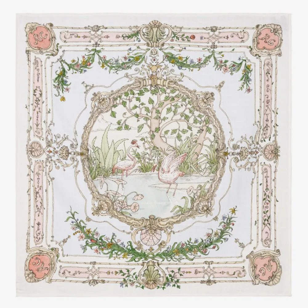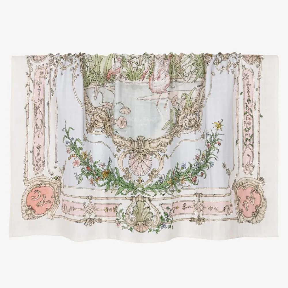 Charming white swaddle for baby boys and girls from luxury French brand Atelier Choux Paris, made in soft organic cotton muslin. Illustrated by famed Swedish artist Mattias Adolfsson, it has a gorgeously detailed pink flamingo design, with lovely green foliage and colourful flowers. It can be used as a light blanket, changing surface or for added privacy while breastfeeding. It comes with a lovely gift box.