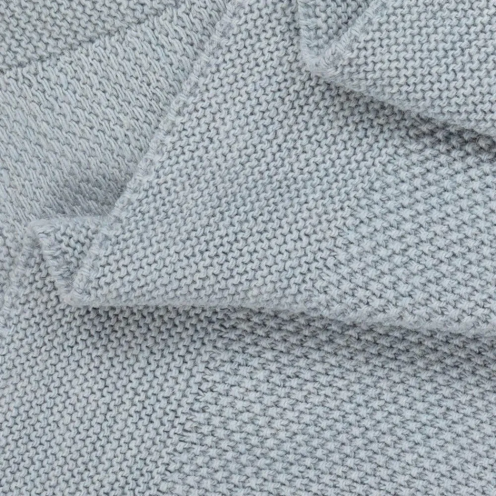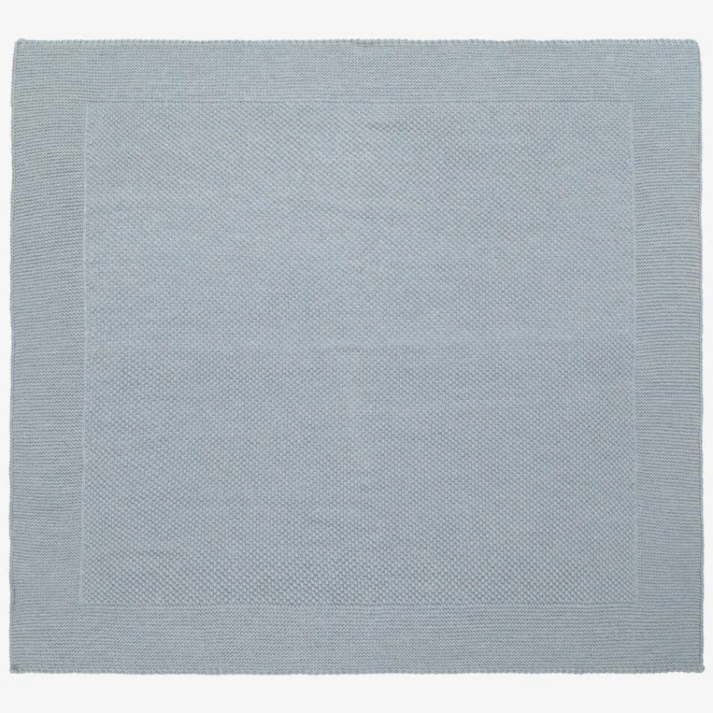 A lovely blue blanket for baby boys and girls by Spanish brand Babidu. Knitted in a luxuriously soft blend of wool and alpaca, it has a moss stitch pattern in the middle, with a classic garter stitch border. Ideal for use in the pram, stroller or car seat, it is also an attractive accessory in the nursery.