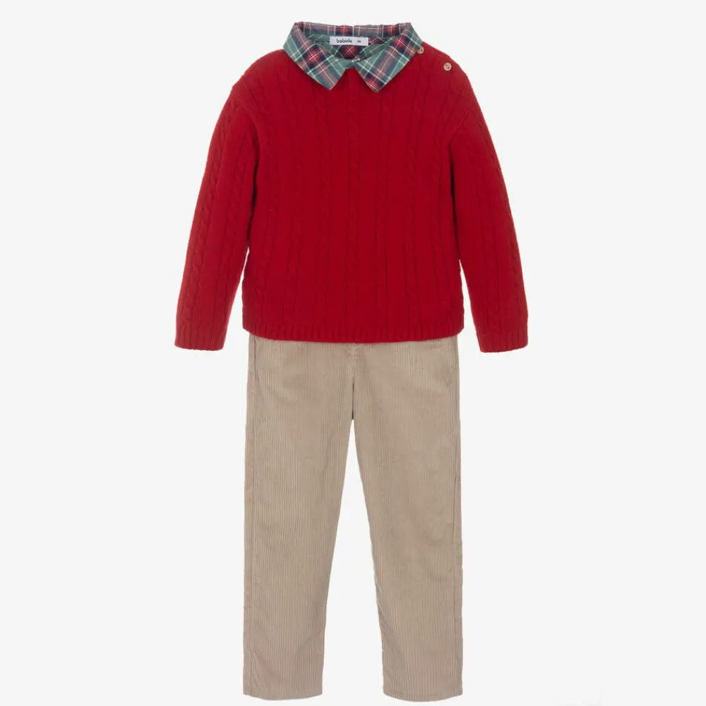 Exclusive to Childrensalon, a casual beige, red and green trouser set for boys by Babidu. The beige corduroy trousers are made in soft cotton and have front pockets and a gently elasticated waist for a comfortable fit. The green and red check shirt is made in soft brushed cotton and fastens with wooden buttons. The set is completed by a cosy red sweater with a lovely cable design on the front. Made with a touch of wool for added warmth, it fastens with wooden buttons on one shoulder.