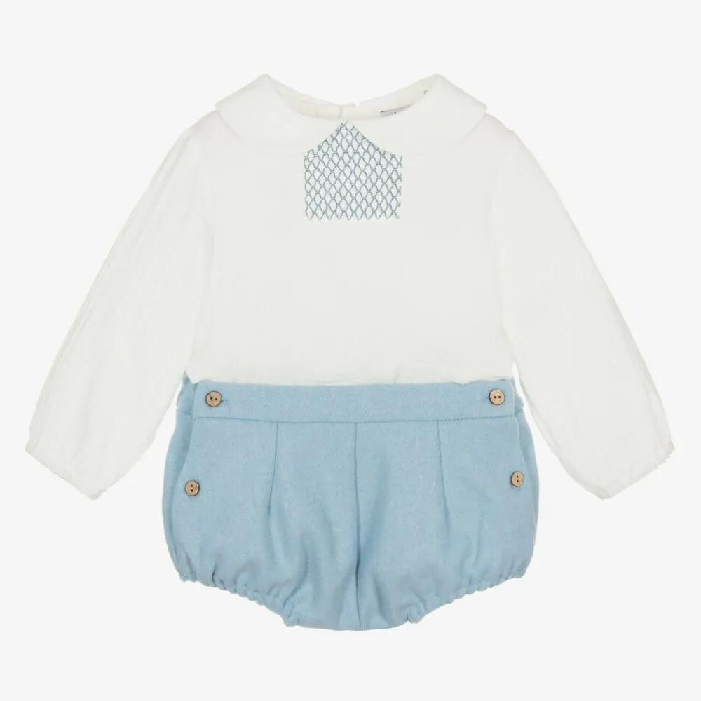 In white and pale blue, this traditional shorts set for little boys is by Babidu. The bubble shorts are made in a soft wool-feel fabric, with wooden buttons to secure at the sides. They are gently elasticated at the back and around the leg openings. The cotton cheesecloth shirt has a rounded collar and classic smocking detail on the chest, with elasticated cuffs and back button fastenings.