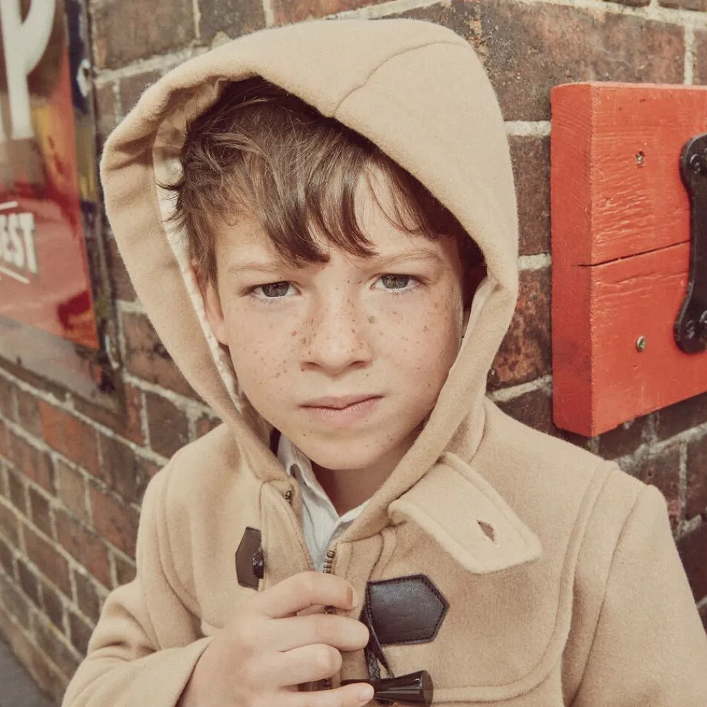 Hooded beige duffle coat for boys and girls by traditional British brand Beatrice & George, exclusive to Childrensalon. Lightly padded, it is made in a beautifully soft and cosy, felted wool blend. There are useful flap pockets on the front, one with a smart, embroidered monogram logo. It has faux bone toggle fastenings, with brown eco-leather loops, and a zip below. It is lined with ivory logo jacquard satin for comfort.