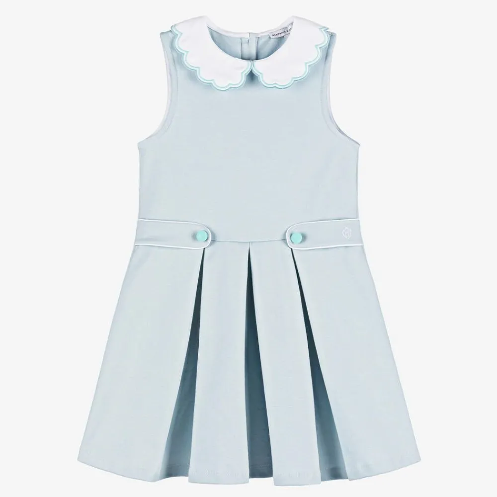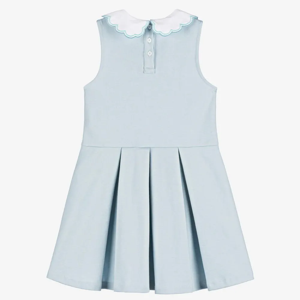 Girls pretty pale blue tennis-style dress by Beatrice & George, exclusive to Childrensalon. Made in comfortable, stretchy Milano cotton jersey, it has a scalloped, white poplin collar with embroidered blue trims. Piped in white, with decorative buttons, there are fixed tabs on the waist, with an embroidered monogram logo on one side.